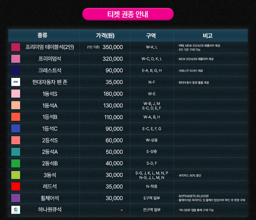 좌석은 프리미엄석, 크레스트석, 1~3등석, 응원석인 레드석, 현대자동차 팬 존, 휠체어석으로 구분되며 가격은 3만 원부터 35만 원까지 형성되어 있습니다.