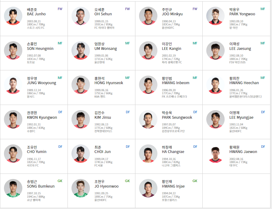연령별 대표팀에서 활약해 온 오세훈, 배준호, 황재원, 최준과 더불어 대표 경력이 전혀 없는 황인재, 박승욱, 하창래까지 총 7명이 처음으로 A대표팀으로 발탁되었습니다.