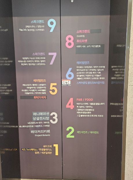 7층부터 9층까지는 스파크 랜드로 대관람차, 디스코오, 미니바이킹 등 8가지 야외 놀이기구를 체험할 수 있어요