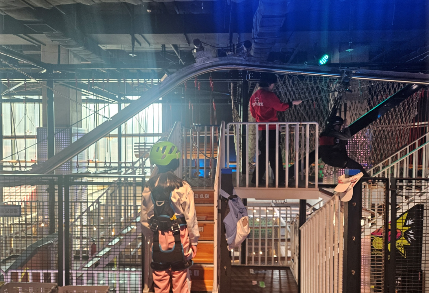 아트 클라이밍, 드롭 슬라이드, 짚코스터, 하이로프, 퀵플라잇 등 아이들이 보호장비를 착용하고 몸으로 체험할 수 있는 것들이 많습니다.