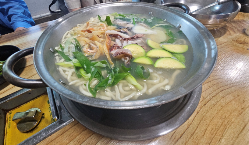 해물칼국수는 큰 냄비에 한꺼번에 나와서 여러 명이 나누어 먹는 스타일이에요