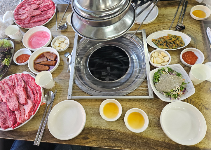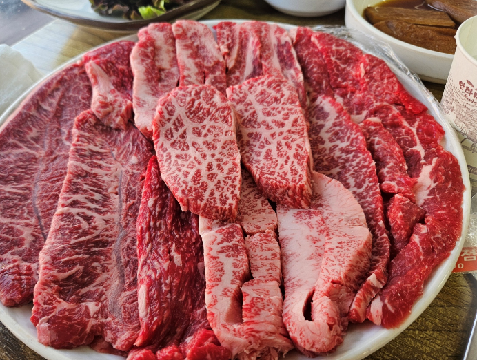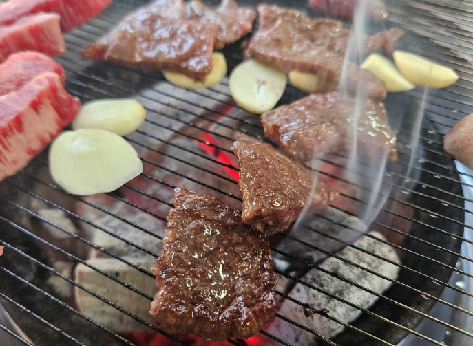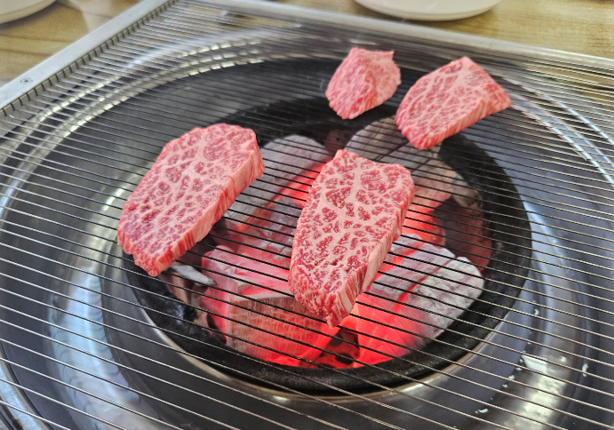1++ 등급 한우의 선홍빛 마블링이 눈에 띄었고 숯불그릴에 구워 먹으니 고기의 풍미가 극대화되었어요. 특히 특수부위는 쫄깃함과 육즙이 조화를 이뤄 입안에서 살살 녹는 맛있어요