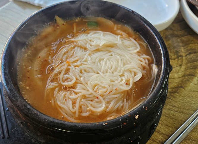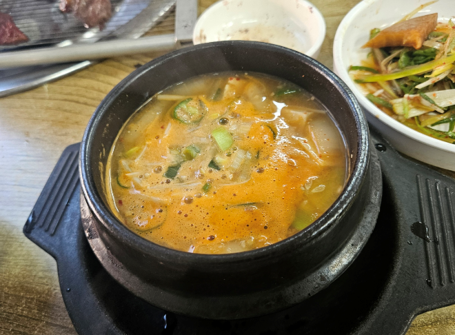 고기를 먹고 식사로 된장국수와 된짱찌개를 주문했어요 고기 이후의 깔끔한 식사로 적합했어요 된장찌개는 깊고 고소한 국물 맛이 일품으로 고기와 함께하는 훌륭한 조화로움을 보여주었어요