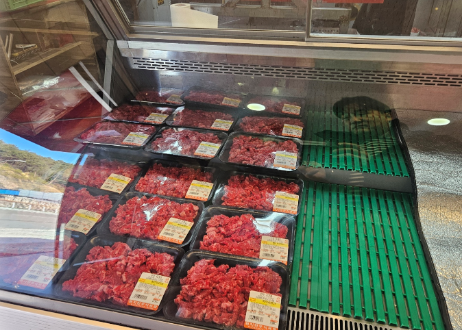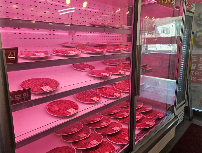 식당 입구에 들어서자 마자 고기를 손질하는 장소와 냉장고 가득 포장된 고기가 진열되어 있습니다. 생각보다 가격이 저렴해서 놀랐어요.