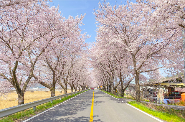 벚꽃 나무들이 도로 양쪽으로 줄지어 있어 그 사이를 차로 운전하면