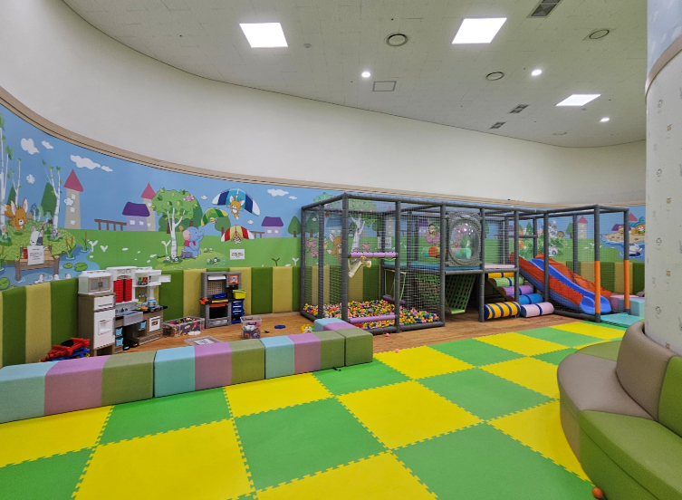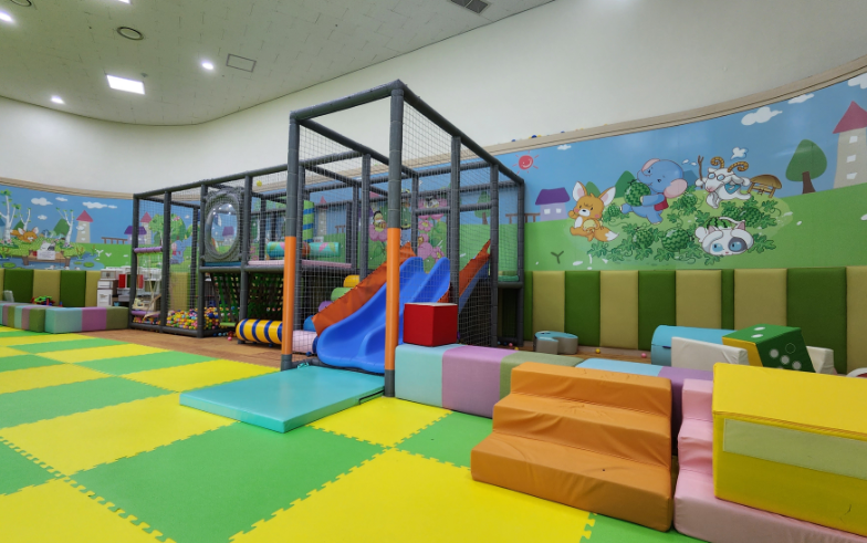 아이들은 실내놀이터에서 놀고 어른들은 카페테리아 의자에 앉아 휴식을 했어요.