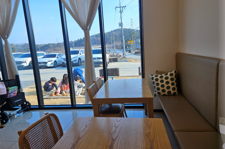 카페 바로 앞에 모래놀이터가 있어서 우리 아이들 주차하자마자 바로 뛰어 들어갔어요. 모래놀이터에서 한참을 놀다가 들어와서 아주 오랜만에 커피 한잔 하면서 휴식을 취할 수 있었어요.