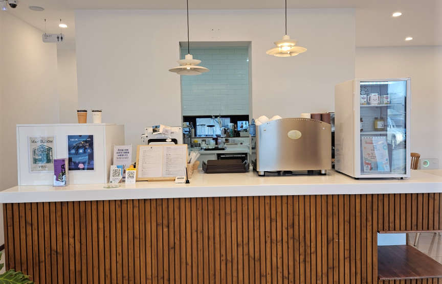 카페 안으로 들어서면 정면에 주문 카운터와 주방이 보이고, 양쪽으로 테이블과 좌석이 배치되어 있어요.
