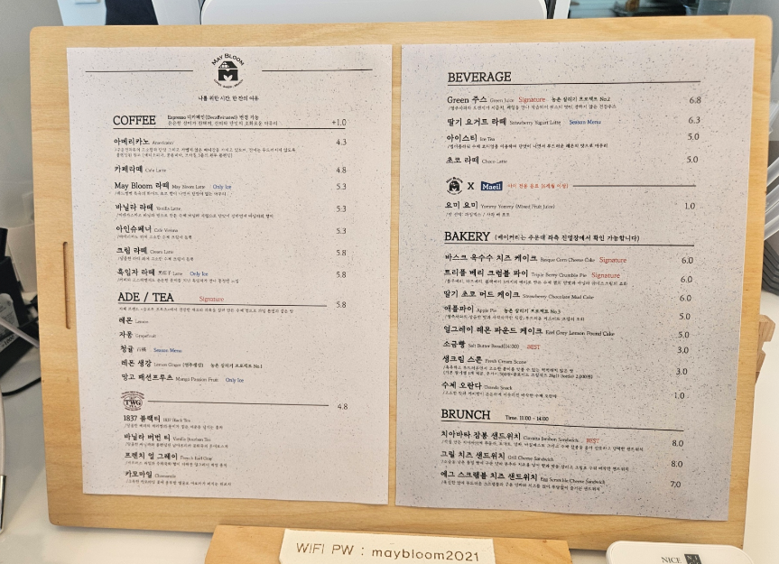 메뉴판을 보니 커피, 음료, 에이드 티, 베이커리, 브런치 메뉴 등 다양한 선택지가 있었어요