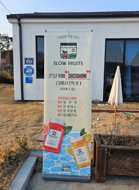 메이블룸에서는 꼭 에이드를 마셔야겠더라고요. 카페에서 직접 담근 수제청을 가지고 음료를 만들어서 방부제, 인공색소, 안공향로, 합성첨가제 없이 만드는 과일청으로 slowFruit라는 자체 브랜드까지 가지고 있어요