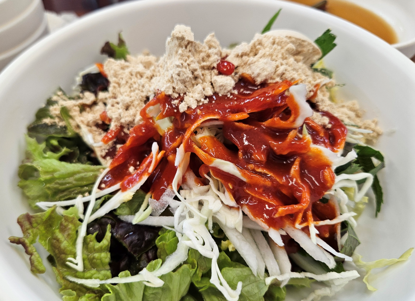 초장도 듬뿍 넣고, 다진 마늘, 콩가루도 함께 넣어서 비벼 먹으면 정말 맛있습니다. 새콤달콤한 맛과 송어의 쫄깃한 식감이 잘 어울렸어요. 쌈채소는 비용 없이 주문하면 추가로 주셨어요