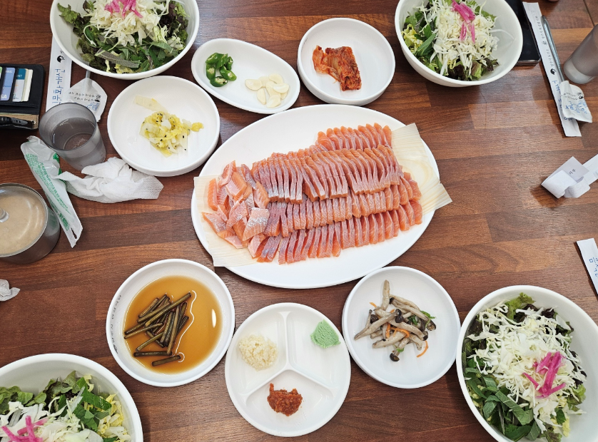 기대했던 송어회가 테이블에 올라왔을 때 그 비주얼에 모두 감탄했습니다. 송어의 윤기가 정말 좋았어요. 다른 송어회집과 다른 점은 두툼하게 고기를 썰어서 한점 먹어도 입안 가득 푸짐했어요