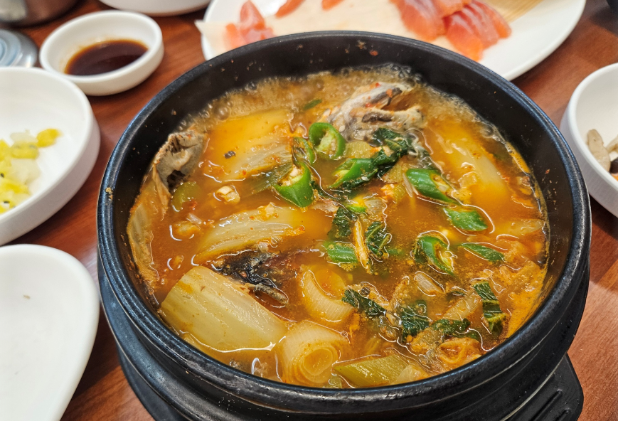 송어회를 거의 다 먹어갈 무렵 뚝배기에 담긴 매운탕이 나왔어요. 국물 맛이 진하고 얼큰해서 송어회의 느낌함을 잡아주는 데 안성맞춤이었습니다.