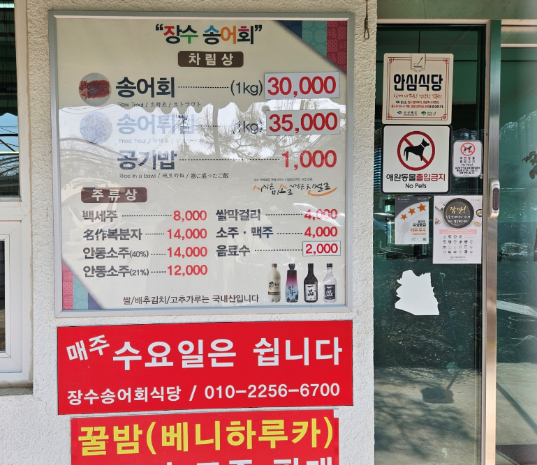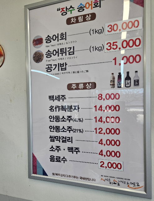 메뉴판을 보니 송어회 1kg당 30000원, 송어튀김 1kg당 35000원이었어요
