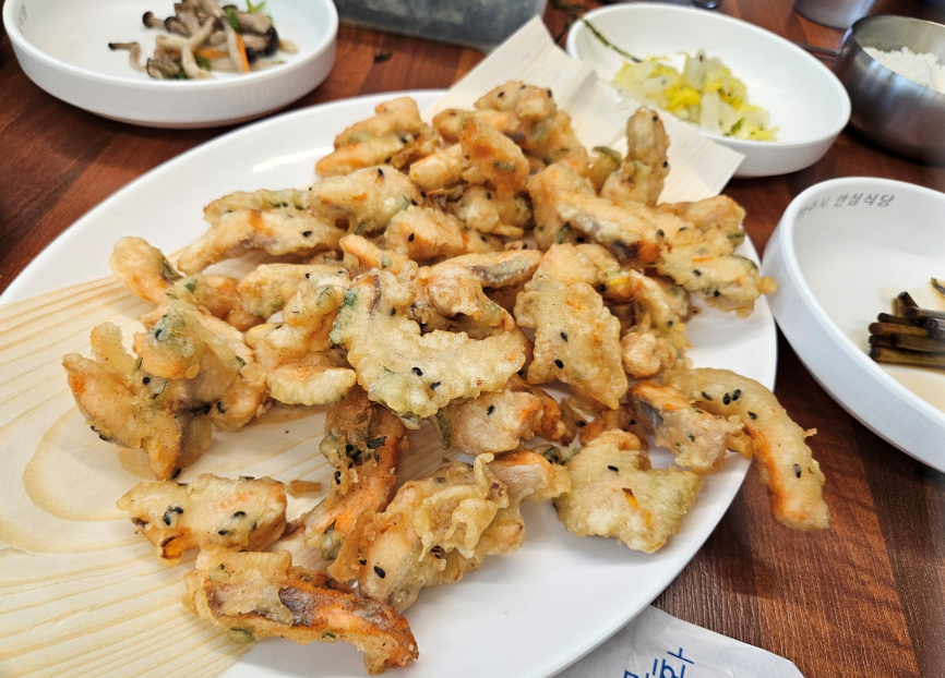 송어회를 좋아하지 않는 아이들을 위해 송어튀김을 시켰는데 아이들이 정말 잘 먹었어요. 바삭한 튀김옷을 입은 송어회가 아이들 입맛에 딱 맞았나 봐요. 해산물을 좋아하지 않는 아이가 있다고 사장님께 말씀드리니 참기름과 김가루를 가져다주시면서 야채와 함께 비벼먹으라고 주셨어요