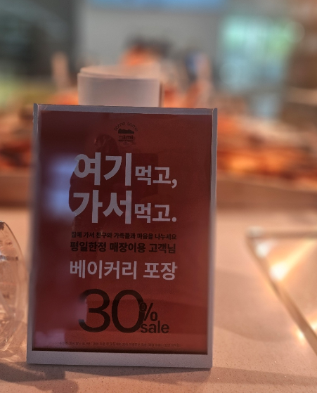 평일에 한정해서 매장이용 시 베이커리를 포장하면 30% 할인을 받을 수 있어요