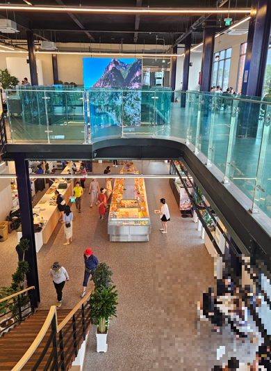 1층에는 좌식으로 앉을 수 있는 공간도 있습니다. 키즈케이존이라고, 신발을 벗고 올라가서 앉는 자리인데 애기가 많이 어린 경우에는 이곳이 더 편할 수 있습니다. 1층과 2층사이 대형 스크린에서 영상이 나오는데 특색 있었습니다. 초대형 스크린을 통해 보이는 영상미 가득한 장면들이 현대적인 카페 인테리어와 잘 어울렸습니다.