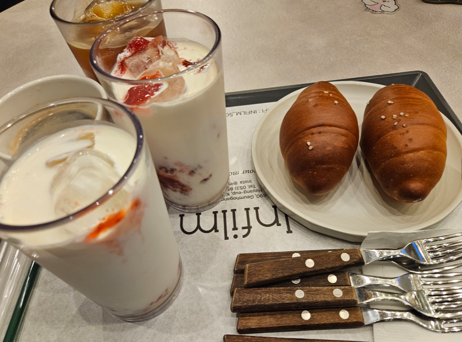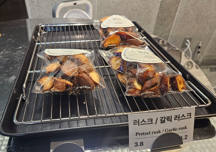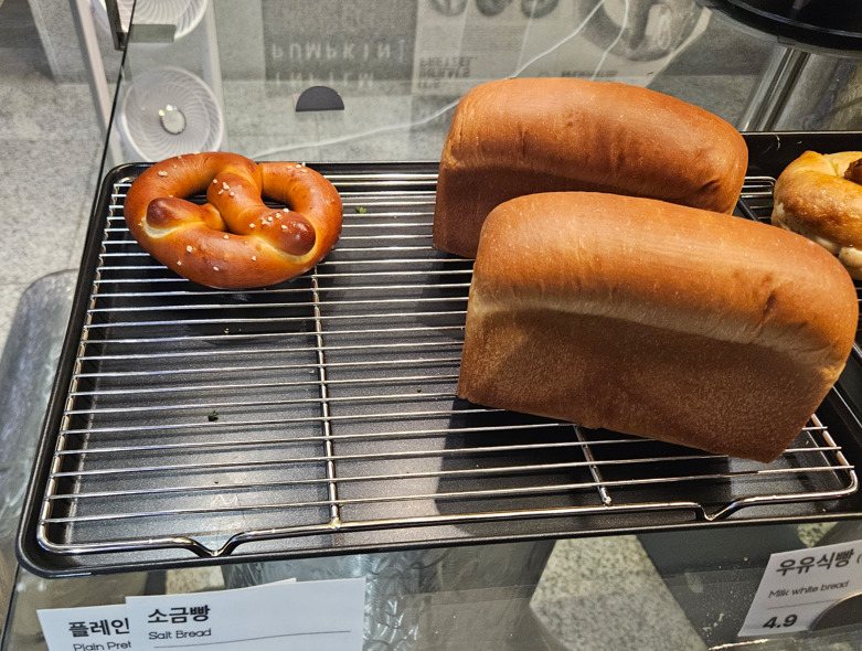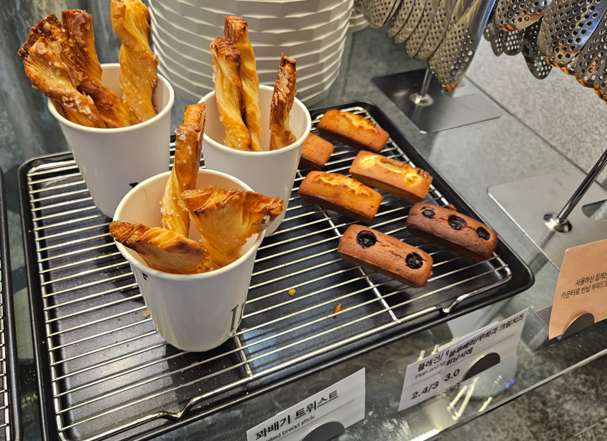주말 저녁에 방문을 했기에 빵이 많이 나간 이유도 있겠지만 카페 규모에 비해서는 빵 종류가 확실히 부족해 보였습니다. 오히려 빵종류가 적으니까 가장 자신 있는 것들만 만들어서 판매를 하는 것인지 더 믿음이 갔어요. 우리 아일들이 제일 좋아하는 소금빵 2개 남았길래 바로 담았습니다. 소금빵 하고 스무디 아이들이 잘 먹는 것을 보니 역시 맛집이었네요