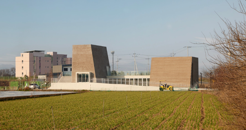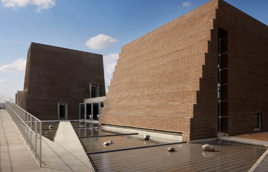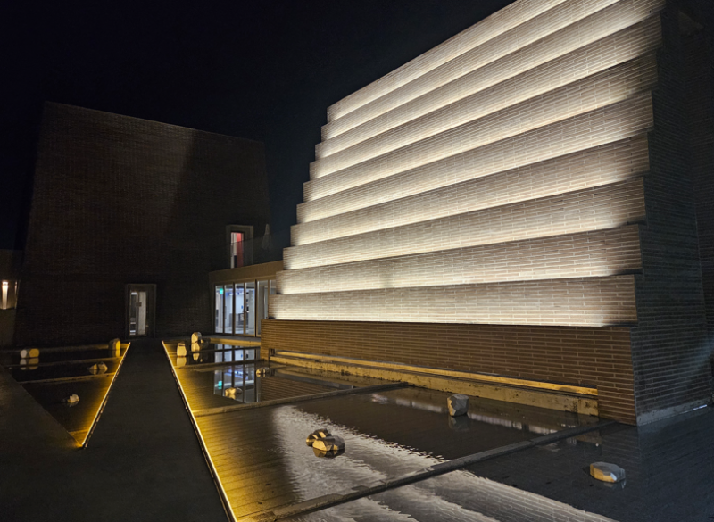 외부 인테리어는 모던하면서도 감각적인 디자인이 돋보입니다. 심플한 피라미드 구조로 반듯하게 지어져 있습니다. 깔끔하고 연한 붉은 벽돌로 외관이 주변 환경과 조화를 이루면서도 독창적인 분위기를 자아냅니다.