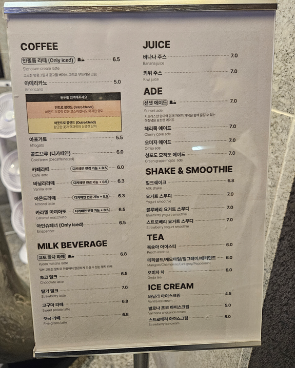 인필름 라떼는 커피 애호가들에게 추천되는 메뉴로 고소한 땅콩크림과 콩고물 베이스에 그리고 부드러운 크림이 올라가 커피와 조화를 잘 이루고 있습니다. 교토 말차 라떼는 일본 교토산 말차를 사용하여 고급스럽고 깔끔한 맛을 제공합니다. 말차의 풍미가 진하고 깊어, 특히 말차를 선호하는 분들에게 좋은 선택이 됩니다. 선셋 에이드는 시트러스 한 향미와 함께 자몽의 과육을 함께 즐길 수 있습니다.