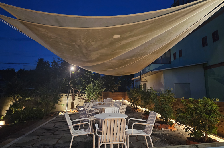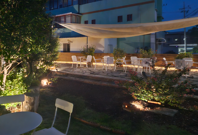 건물 외관은 모던하면서도 트렌디한 디자인이 돋보였습니다. 오래된 주택을 리모델링해서 만든 카페로 실제로 정원 딸린 주택정도의 조그마한 카페입니다. 마당에 정원도 이쁘게 가꾸어 놓았습니다. 야외 테이블과 의자도 있고 타프도 설치해서 낮에서 그늘아래에서 정원을 바라보며 여유를 즐기기 좋아 보였습니다.