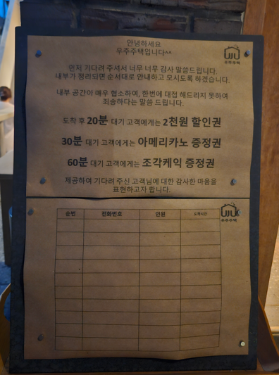 카페 입구에 안내표지판을 보고 놀랐습니다. 도착 후 20분 대기 고객에게는 2천원 할인권을, 30분 대기 고객에게는 아메리카노 증정권, 그리고 60분 대기 고객에게는 조각케이크 증정권을 준다는 안내판이었어요. 얼마나 대기를 많이 하면 이런 공지가 있는지 실로 우주주택의 인기를 체감하겠더라고요.