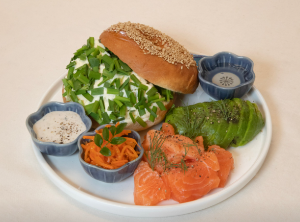 이 메뉴는 고소한 베이글에 대파 크림치즈가 듬뿍 발라져 있어 단짠의 조화가 훌륭합니다. 부드럽고 풍미가 깊은 크림치즈와 대파의 독특한 향이 조화를 이룹니다.