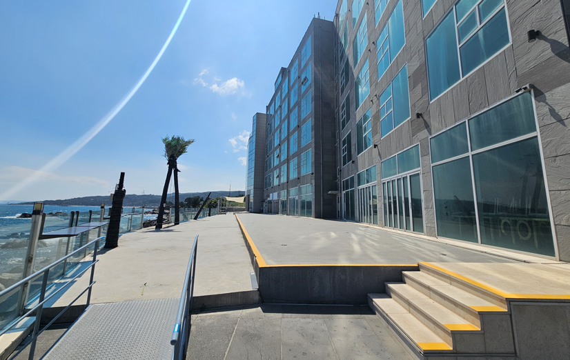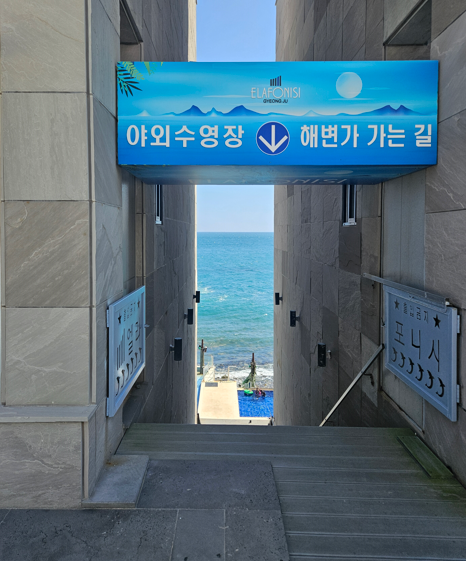 1층 주차장에서 야외수영장 가는 길입니다. 힐긋 보이는 바다 배경으로 사진을 많이 찍으시더라고요. 가는 길마다 사진 찍을 곳이 정말 많아요