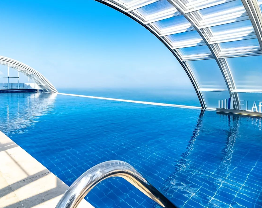 호텔의 하이라트 중 하나는 루트탑에 위치한 인피니티 풀입니다. 날씨가 좋으면 야외 수영장처럼 사용할 수 있고, 비가 오는 날에는 돔 형태로 전화되어 실내 수영장처럼 쓸 수 있어 편리합니다.