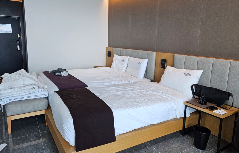 최고의 장점은 전 객실이 오션뷰라는 겁니다. 엘라포니시는 풀빌라동과 호텔동이 따로 되어있습니다. 제가 묵었던 방은 디럭스룸으로 넓고 깨끗한 침구와 미니멀한 인테리어가 인상적이었어요.