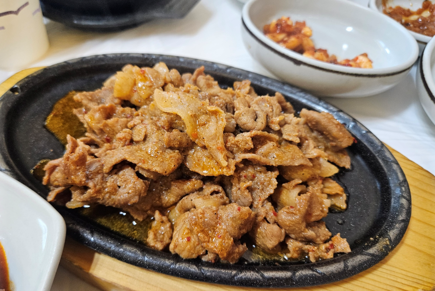 드디어 주문한 음식이 나왔어요. 중앙에는 뜨끈한 제육이 담긴 돌판이 놓여 있었고, 주변에는 여러 가지 반찬들이 가득했어요. 고기는 잘 구워져서 겉은 바삭하고 속은 촉촉했답니다.