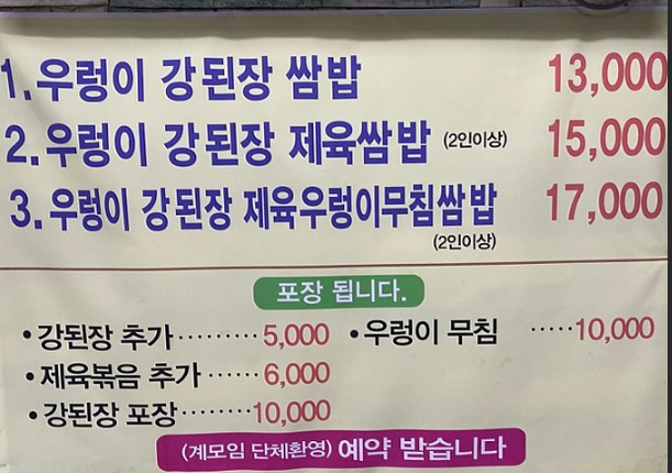 벽면에 현수막으로 붙어 있는 메뉴판을 살펴보았습니다. 맛집답게 단출한 메뉴판입니다. 우렁이 강된장 쌈밥은 13,000원 우렁이 강된장 제육쌈밥은 15,000원 우렁이 강된장 제육 우렁이 무침쌈밥은 17,000원입니다. 강된장을 추가하면 5,000원 제육볶음 추가는 6,000원, 우렁이 무침은 추가로 10,000원을 받습니다. 저희는 4인가족으로 1번 세트 2개, 2번 세트 2개를 주문했습니다. 막내가 우렁이 강된장이 낯설까 봐 제육이 들어있는 쌈밥을 주문했어요