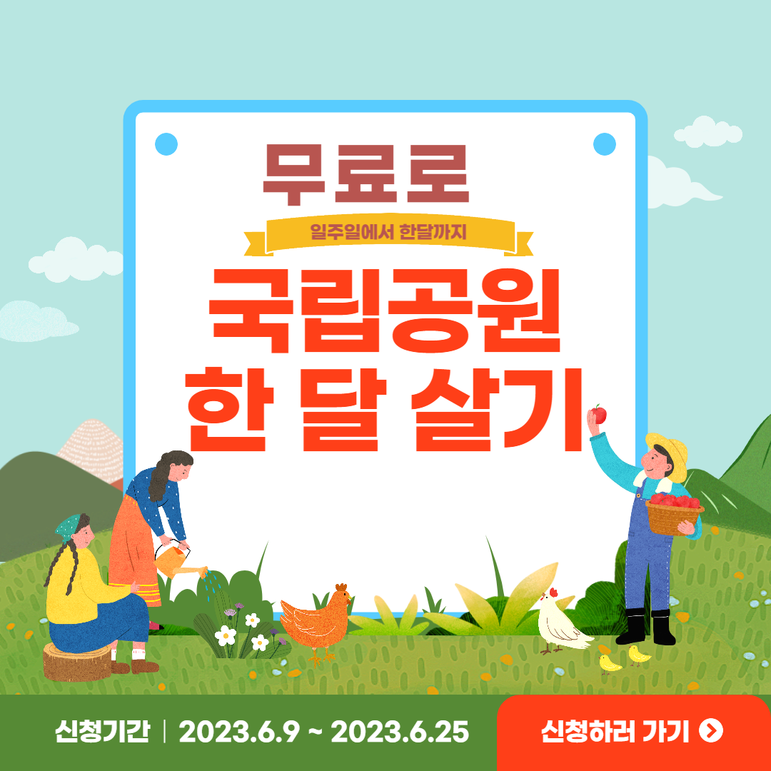 이번 아이들 방학때 아름다운 풍경과 다양한 생물들이 가득한 국립공원에서 한 달을 살아보면서 자연과의 깊은 만남을 경험하고, 일상에서 놓치기 쉬운 소중한 순간들을 찾아보는 시간을 가져보는 것은 어떨까요? 생각만 해도 아이들에게는 잊을 수 없는 추억이 되고, 어른들에게는 도시생활에 지친 몸과 마음을 힐링할 수 있는 좋은 기회가 될 것 같습니다. 숙소를 무료로 제공해 주는데 끝이 아니라 일주일 단위로 활동비 15만 원도 준다고 하니 신청 안 할 이유가 없습니다. 지금 바로 신청해 보세요.