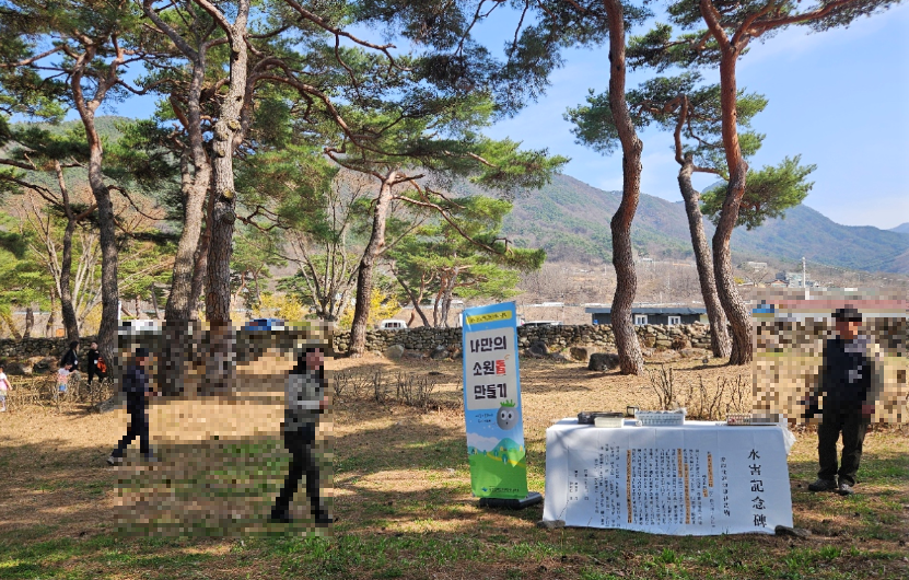 넓은 잔디밭에 수많은 소나무들과 솟대, 당산나무가 있습니다.