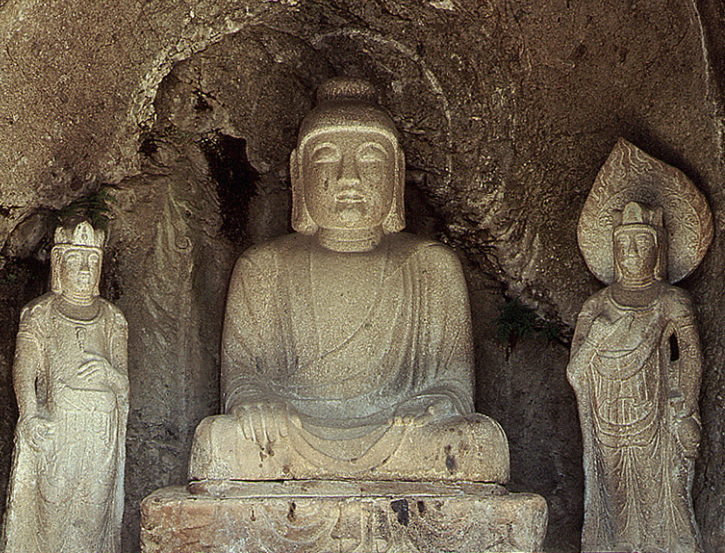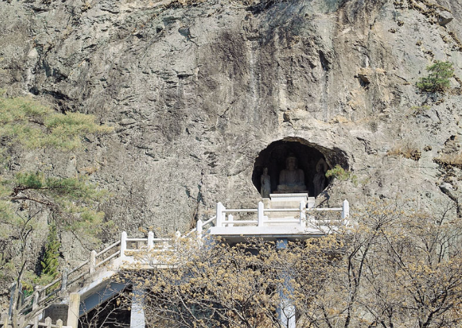 석굴을 방문하면서 느낀 첫인상은 주변 자연과의 완벽한 조화였습니다. 입구로 이어지는 숲길은 한적하고 고요한 분위기를 풍기며, 마치 과거로 시간 여행을 떠난 듯한 느낌을 줍니다. 석굴 앞에는 작은 연못과 돌계단이 있어 자연경관을 배경으로 삼존불을 감상할 수 있었습니다. 외부에서는 삼존불을 선명히 볼 수는 없지만, 자연 속에 자리한 석굴의 모습 자체가 신비로운 분위기를 자아냈습니다.