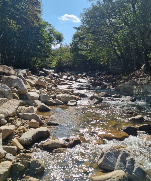 아이들과 함께 물속에서 발을 담그고 더위를 식히고, 맑은 공기를 마시며 여유를 만끽했습니다. 계곡의 물은 매우 깨끗해 발을 담그기만 해도 청량감을 느낄 수 있었습니다. 주변에는 돗자리를 펴고 쉴 수 있는 평탄한 자리가 있어 간단한 간식이나 도시락을 즐기기에도 좋아 보였습니다.