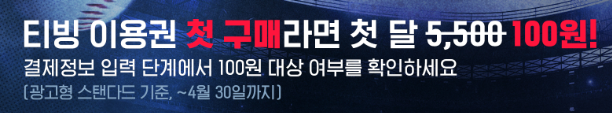 그러나 4월 30일까지 티빙 이용권을 처음 구매하는 사람이라면 첫 달 100원으로 광고형 스탠다드를 이용가능하다고 하니 늦기 전에 꼭 신청하세요