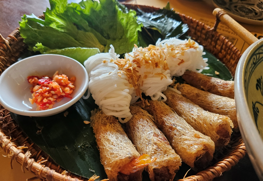 가족끼리 가면 무조건 하나쯤 시키기 좋은 “안전픽”이에요. 사진처럼 짜조가 여러 개 나와서 나눠 먹기 좋고, 쌀국수면(분) + 허브를 곁들이면 튀김이지만 느끼함이 확 줄어요.