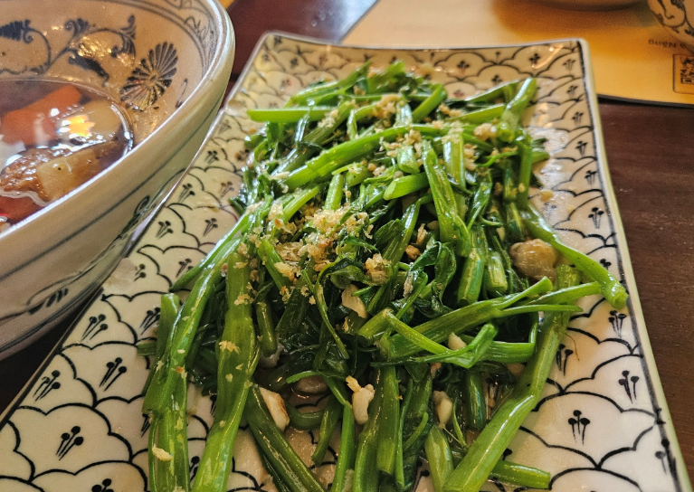 반쎄오/짜조 사이에 먹으면 입이 딱 정리돼요. 마늘 향이 확 올라오고(사진상 토핑도 보임), 아삭함이 남아있어서 “리셋용 반찬”으로 최고였습니다.
