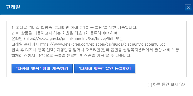 25세 미만 자녀가 2인 이상인 가구 중 2자녀 가구는 어른 운임의 30%, 3자녀 가구는 어른 운임의 50%를 할인해 줍니다. 코레일 홈페이지 접속해서 부모 중 1명의 회원번호를 입력하여 인증을 합니다.