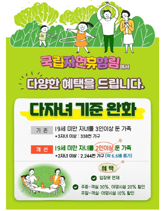 산림청이 2024년 6월 11일부터 국립자연휴양림 이용료 감면기준을 기존 3자녀에서 2자녀 가정으로 완화했습니다. 숲나들e 홈페이지에서 가끔 산림휴양시설을 이용하는 저로서는 아주 반가운 소식인데요 시설이용요금을 주중에는 객실 30%, 야영시설 20%, 주말에는 객실과 야영시설 이용료를 각 10%씩 할인받을 수 있습니다. 또한 국립자연휴양림 입장료까지 면제받을 수 있습니다.