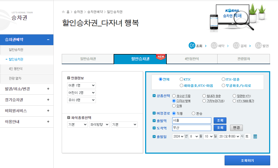 한번 등록해 두면 할인 적용이 되는데요 단, 승차권 예매를 할 때 할인승차권인 다자녀 행복 탭으로 이동해서 조회를 해 주시기 바랍니다.