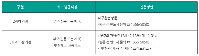 3자녀 이상 가정이라면 부모와 만 13세에서 만 18세 자녀는 대구은행을 방문하고, 만 6세에서 만 12세 자녀는 주소지 보건소를 방문해야 카드를 발급받을 수 있습니다.