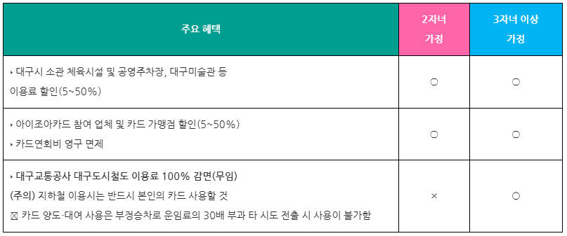 대구시 소관 체육시설 및 공영주차장, 대구미술관 등 이용료 할인이 되는 점, 아이조아카드 참여 업체 및 카드 가맹점 할인이 되는 등 모든 혜택은 동일하나, 대구도시철도 이용료 무료는 3자녀 이상만 가능합니다.