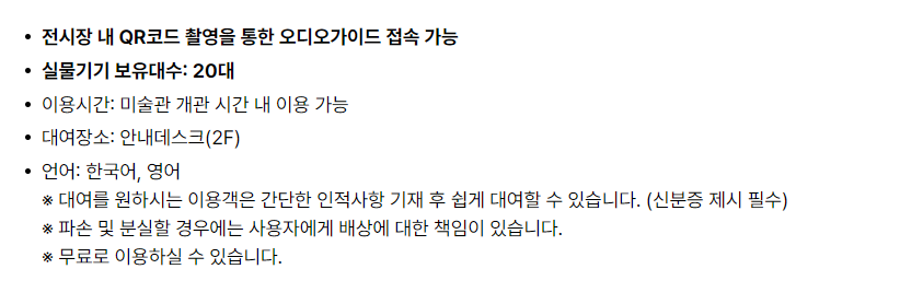 전시장 내 QR 코드 촬영을 통한 오디오가이드에 접속이 가능합니다. 오디오 가이드를 위한 실물기기를 20대를 안내데스크에서 무료로 대여가 가능합니다. 주말에서 대여하는 사람이 많아서 가족당 하나의 기계만 대여를 해줬는데 이어폰을 가져가신다면 QR코드를 사용해 본인의 핸드폰으로 전시 설명을 듣는 것도 가능합니다. 기기 대여를 희망하시는 분은 신분증을 제시하고 간단한 인적사항 기재 후 대여가능합니다.