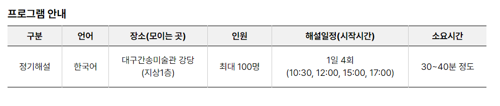 대구간송미술관은 정기 해설을 전시관람객 누구나 자유롭게 참여할 수 있습니다. 1일 4회 30~40분 정도 전시전문해설사가 설명을 해 주시는데 설명을 듣고 관람하는 것이 훨씬 문화재에 대한 이해의 폭을 넓힐 수 있습니다. 간송 미술관의 역사와 전형필 선생님, 그리고 문화재에 대해 자세히 설명해 주시는 것이 좋았습니다.