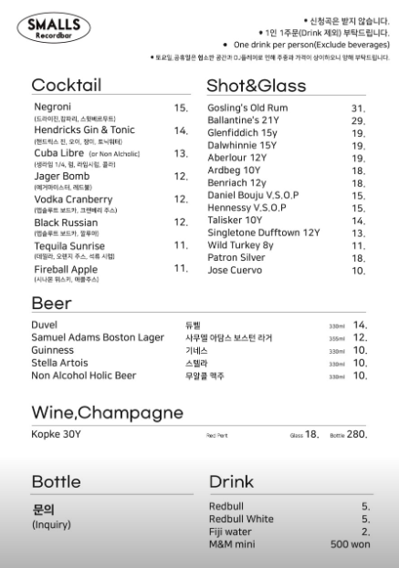 메뉴는 칵테일, 맥주, 샷, 와인, 샴페인, 위스키 등 다양한 주류 메뉴를 판매하는 곳이랍니다.