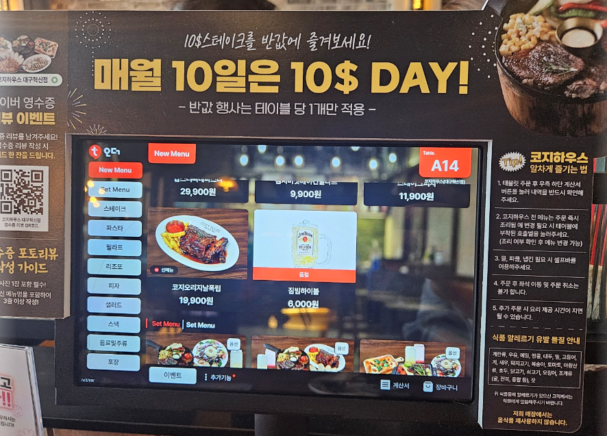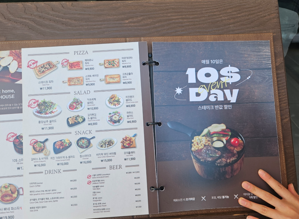 그 외에도 매월 10일에는 10$ 스테이크를 6900원에 먹을 수 있는 십일데이 이벤트도 있으니 매달 10에는 코지하우스에서 외식하면 이득이에요