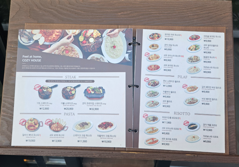 코지하우스는 스테이크와 파스타, 피자를 주로 하는 양식 레스토랑입니다.