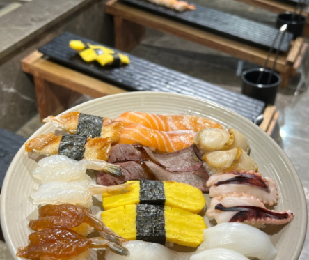 특히 스시의 밥 양이 적고 회가 두툼한 게 좋았어요. 스시 코너에는 연어, 소고기, 유부, 새우, 생새우 등 다양한 종류의 스기가 있고 밥 양이 적어 부담 없이 여러 종류를 맛볼 수 있었어요
